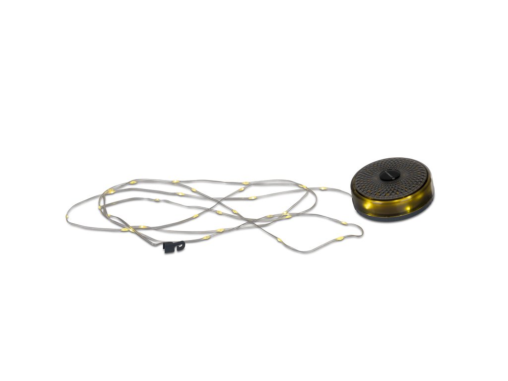 LED světla připojené na kabel asi 8 m dlouhý, které lze rozvinout kolem stanu, markýzy nebo stromů a vytvořit útulné osvětlení.