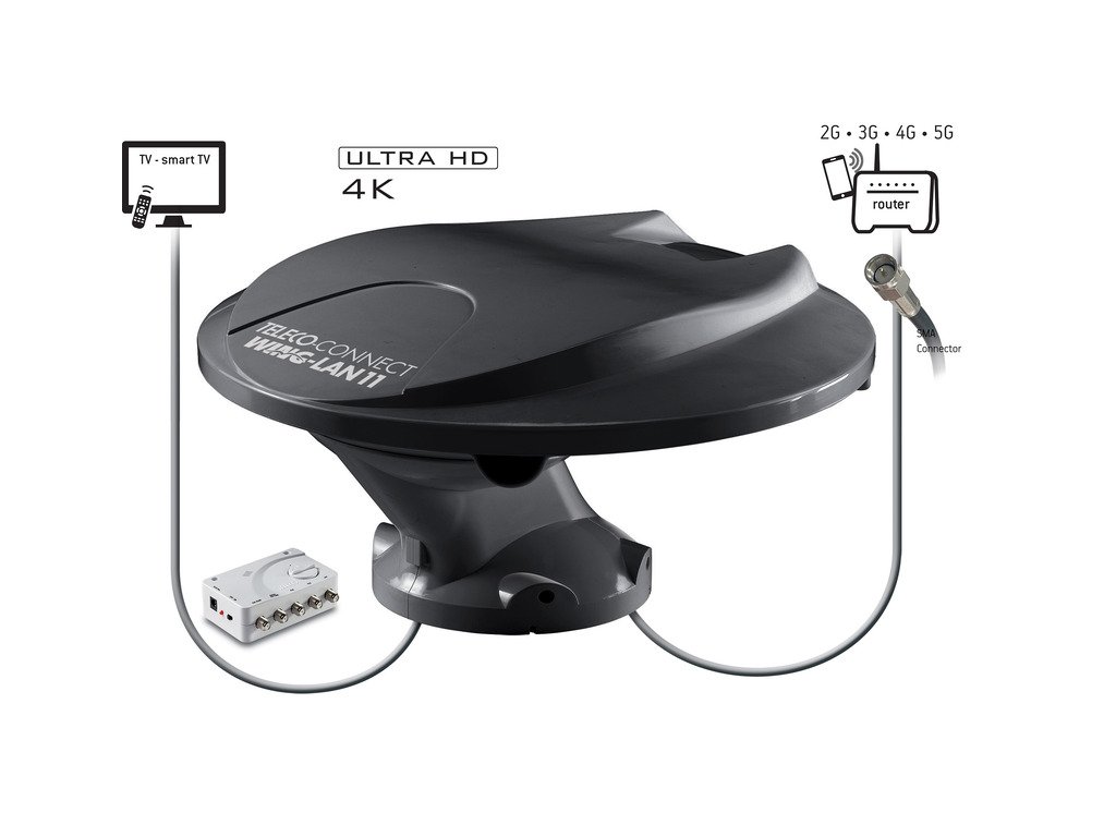 Mobilní internet (3G/4G/5G): anténa zachytí signál mobilních sítí, který vede do mobilního routeru s SIM kartou — ten pak udělá Wi-Fi hotspot v autě či karavanu (např. Teleco WFT402 nebo jiný kompatibilní router).