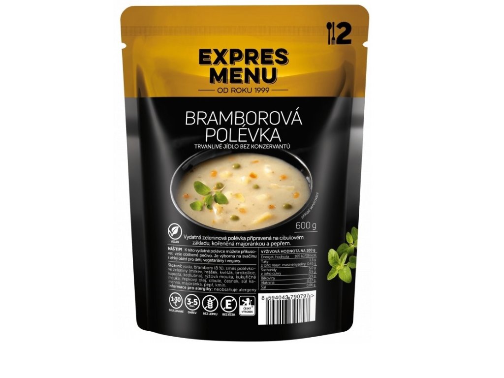 Bramborová polévka Expres Menu je poctivá domácí polévka připravená z kvalitních brambor, zeleniny a koření. Je výživná, hustá a skvěle zasytí. Díky sterilaci bez konzervantů si uchovává výbornou chuť, dlouhou trvanlivost a velmi rychlou přípravu – ideální volba na cesty, do kempu, na dovolenou i jako domácí jídlo bez starostí.