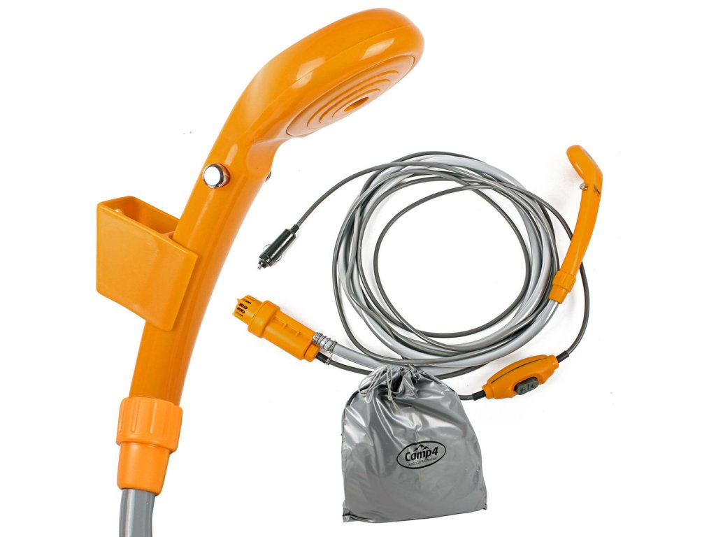 Přenosná sprcha disponuje integrovaným 12V čerpadlem a vypínačem