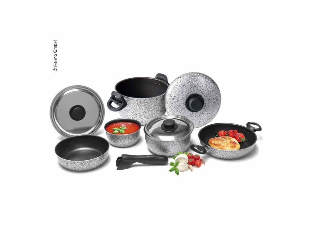 1 hrnec Ø 22 cm, 1 poklička, sítko 22 cm, 1 pánev Ø 22 cm, 2 hrnce Ø 14 a 18 cm, 1 pánev Ø 20 cm, 2 pokličky Ø 18 a 20 cm, 1 odnímatelná rukojeť