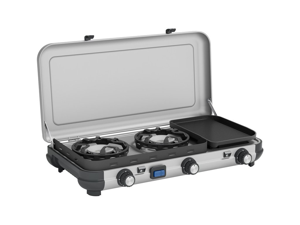 Všestranný venkovní plynový vařič s grilem a třemi varnými zónami, ideální pro kempování, obytné vozy, pikniky i dlouhé výlety, když chceš vařit, dusit i grilovat najednou bez potřeby zápalek
