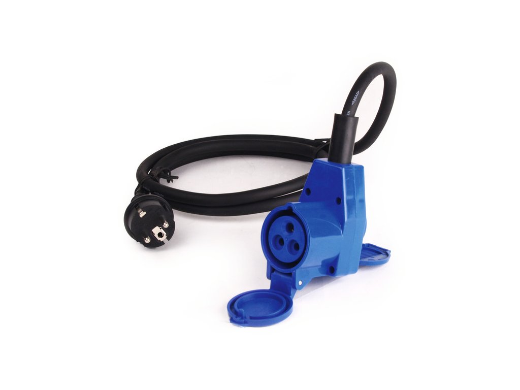 Kabel má na jedné straně běžnou 230 V zástrčku, kterou zapojíte do domácí zásuvky, a na druhé straně CEE konektor, který patří do karavanu nebo kempové přípojky.