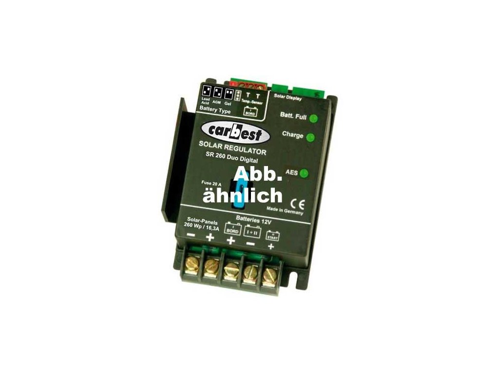 Automaticky nabíjí napájecí a startovací baterii. Nabíjecí programy pro gelové, kyselinové/tekuté a AGM/filcové baterie. Vstup pro teplotní senzor baterie je u gelových a filcových baterií užitečný. LED diody indikují "Nabíjení" a "Plné". Připojení pro solární počítač. DUO digitální modely SR 260 a SR 300 navíc s výstupem pro spínání AES chladniček.