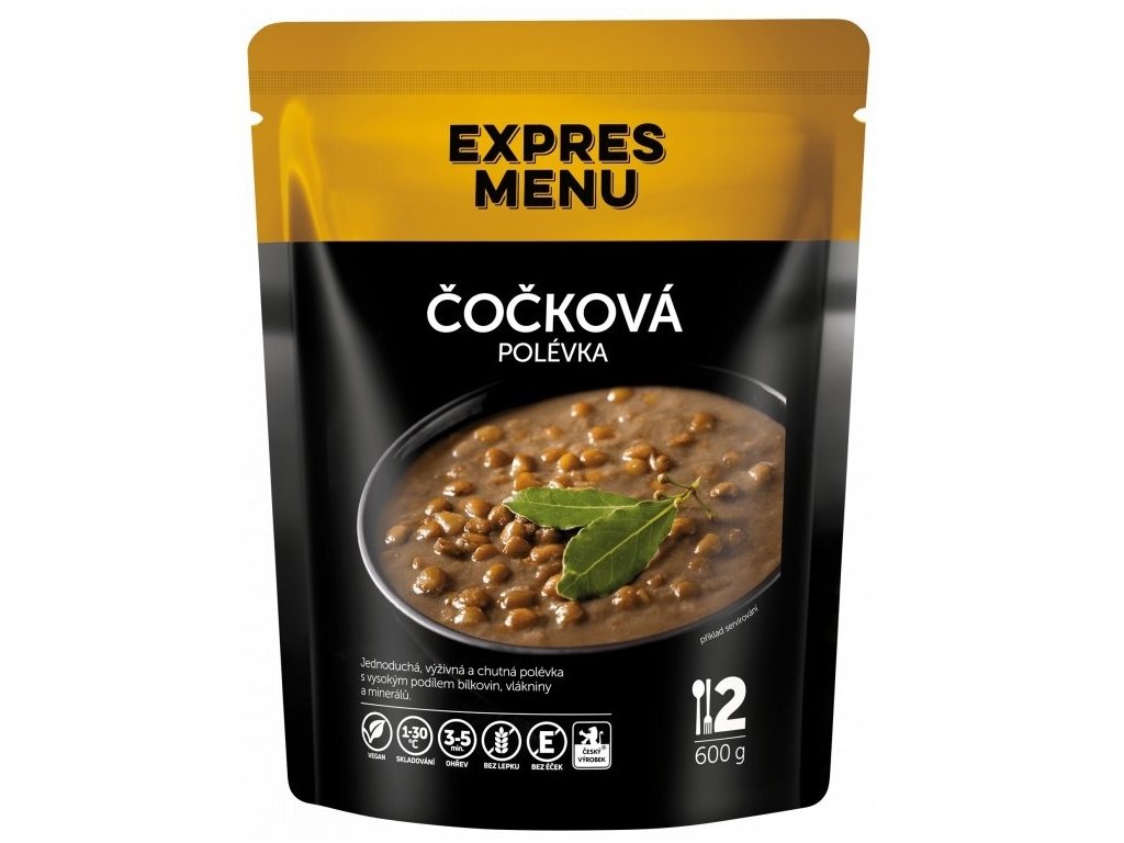 Expres Menu Čočková polévka 600 g je poctivá, sytá a výživná polévka bez konzervantů, připravená z kvalitní zeleniny a luštěnin. Díky sterilaci si zachovává skvělou chuť, dlouhou trvanlivost a je ideální na cesty, do práce i jako rychlé domácí jídlo – stačí jen ohřát.