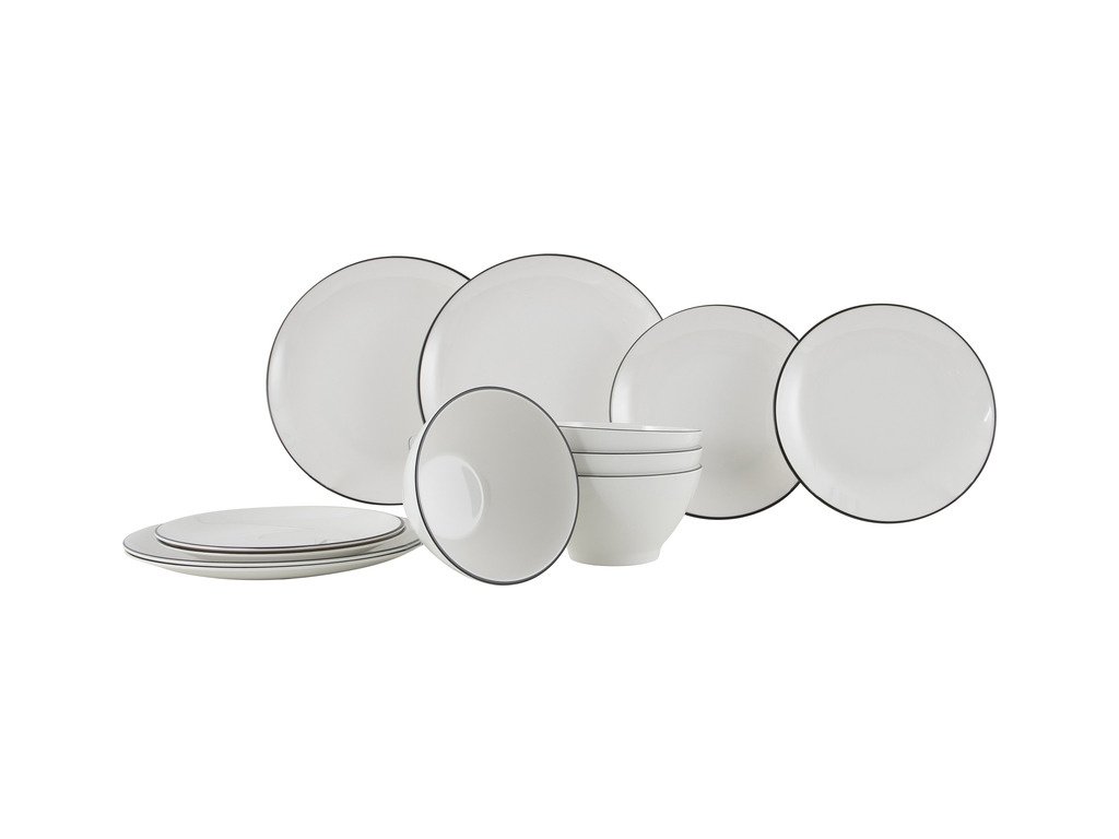 | Specifikace: | Materiál: <strong>100% Melamin (schváleno pro potraviny)</strong> Vhodné pro: 4 osoby <strong>Sada obsahuje 12ks nádobí včetně protiskluzového pruhu</strong> Barevné provedení:<strong> bílá s černým pruhem</strong> |