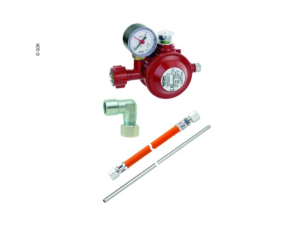 Složení: Redukční ventil typu EN61-DS s bezpečnostním zařízením proti přetlaku S2SR (ÜDS), vizuální indikátor, tepelná uzavírací zařízení "T" (TAE), manometr, středotlaká hadice (guma s textilní vložkou; odolná vůči chladu až do -30 °C;