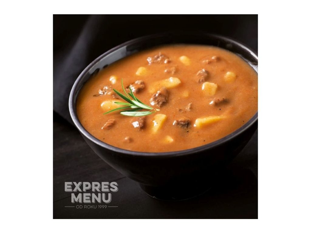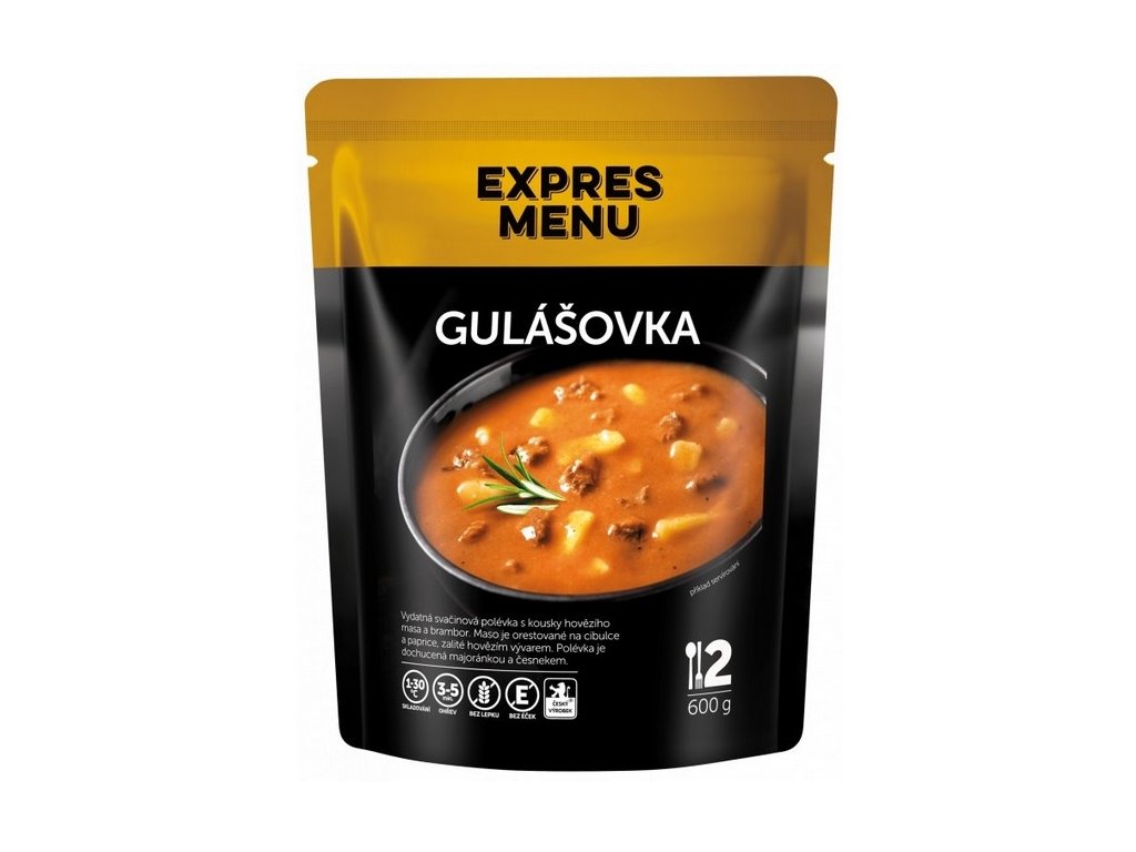 Gulášová polévka Expres Menu je poctivá domácí polévka připravená z kvalitního hovězího masa, brambor, cibule a papriky. Je hustá, sytá a plná výrazné gulášové chuti. Díky šetrné sterilaci bez konzervantů si uchovává výbornou chuť, dlouhou trvanlivost a velmi rychlou přípravu – ideální volba na cesty, do kempu, na dovolenou i jako rychlé domácí jídlo bez starostí.