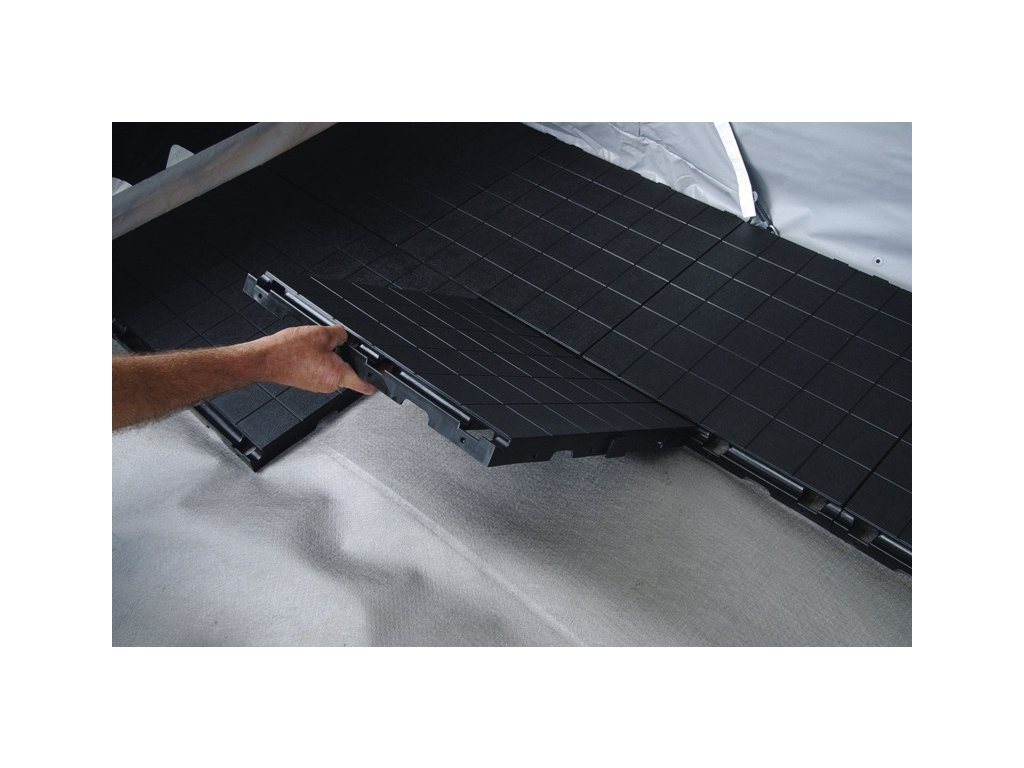 Hit pro sezónní a stálé kempaře: Rovný povrch, plochý koberec a žádné stoupající chlady na jaře a na podzim. Montáž je jednoduchá: Není potřeba žádné nářadí, protože prvky mají západkové čepy a dají se spojovat jako stavebnice. Základní prvek měří 50 x 50 cm, k tomu jsou k dispozici zkosené rohy a okrajové prvky. Nízká hmotnost. Možnost úpravy pomocí pily. Lze použít s nebo bez kobercové podložky.