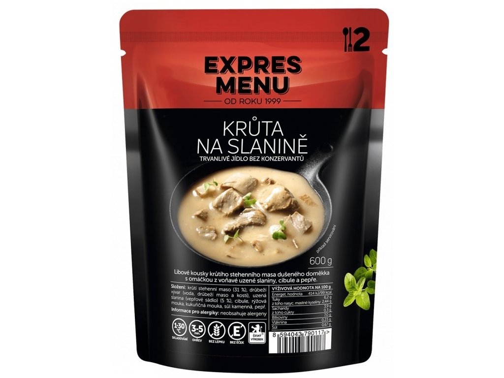 Krůta na slanině Expres Menu je poctivé hotové jídlo z kvalitní krůtí kýty a křupavé slaniny, jemně doplněné kořením a omáčkou. Výživné, vydatné a připravené k rychlé konzumaci. Díky sterilaci bez konzervantů si zachovává chuť, dlouhou trvanlivost a je ideální na doma, na cesty či do kempu.