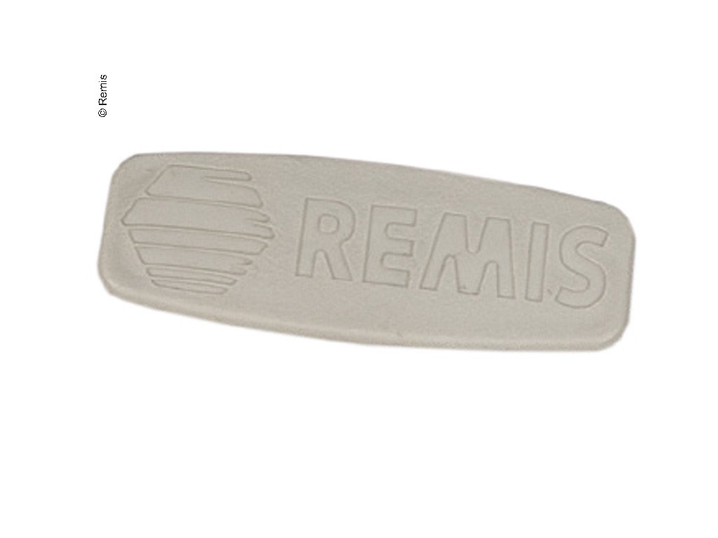 Šedá krytka s logem REMIS určená jako náhradní díl pro předokenní stínící systém RemiFront IV (model 2008, například pro Fiat Ducato). Tato krytka slouží k estetickému a funkčnímu zakrytí upevňovacích šroubů nebo otvorů v oblasti přední kabiny, kde je instalován systém zatemnění od firmy Remis.