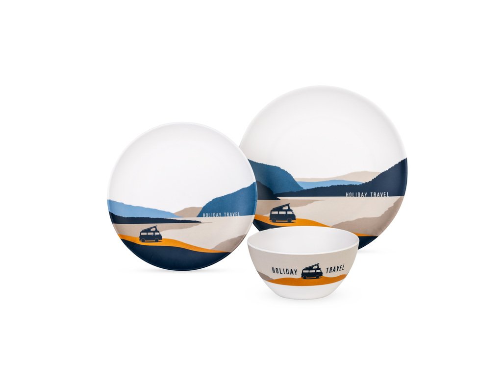 Praktický melaminový jídelní set „Spirit“ (Holiday Travel) pro 2 osoby – ideální sada pro kempování, obytný vůz, dovolenou nebo pikniky. Tento typ setu je lehké a odolné nádobí, které se skvěle hodí pro použití venku i doma.