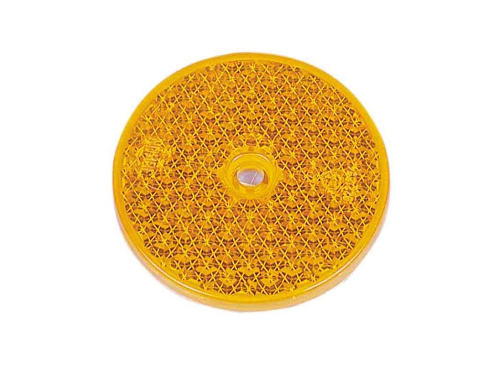 Kulatá žlutá odrazka, který se používá jako bezpečnostní/pravoúhlý odrazový prvek na automobilech, obytných vozech, karavanech, přívěsech nebo jiných vozidlech.