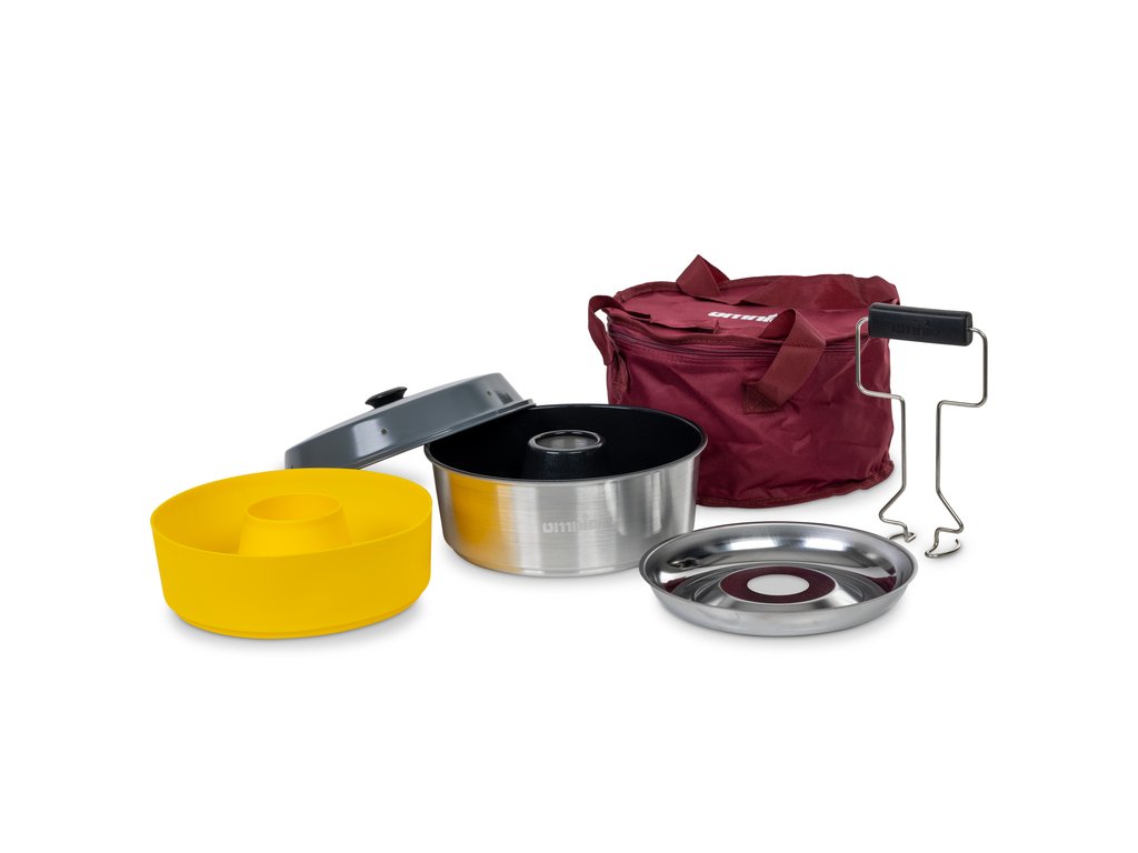 Omnia Backofen Kit Maxi je praktický kempingový pečicí set s nepřilnavou „Maxi“ formou a silikonovou vložkou – ideální pro pečení a zapékání v malém prostoru bez klasické trouby. Díky antiadhézní úpravě a kompletnímu balení (včetně přenosné tašky) je to univerzální a přenosné řešení pro každou dovolenou či cestu karavanem/camperem.