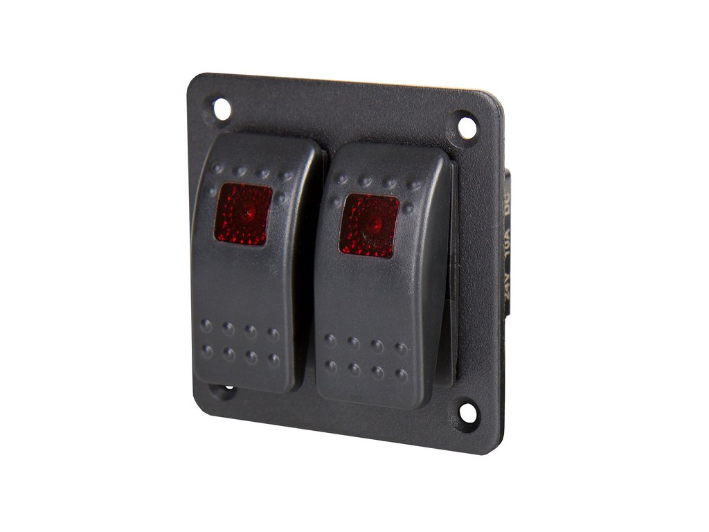 Kompaktní hliníkový spínací panel vybavený dvěma kolébkovými vypínači a možností připojení zásuvek a kabeláže. Panel je určen pro použití v karavanech, obytných vozech, lodích a dalších mobilních elektroinstalacích, kde umožňuje jednoduché a přehledné ovládání elektrických zařízení z jednoho místa.