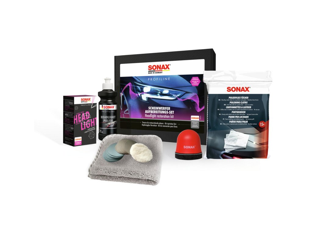 Profesionální kompletní sada na renovaci světlometů vhodná pro odstranění žloutnutí, matnosti a jemných škrábanců z plastových světlometů a obnovení jejich čirosti. Obsahuje brusné papíry, polituru, ochranné utěrky a další potřebné příslušenství.