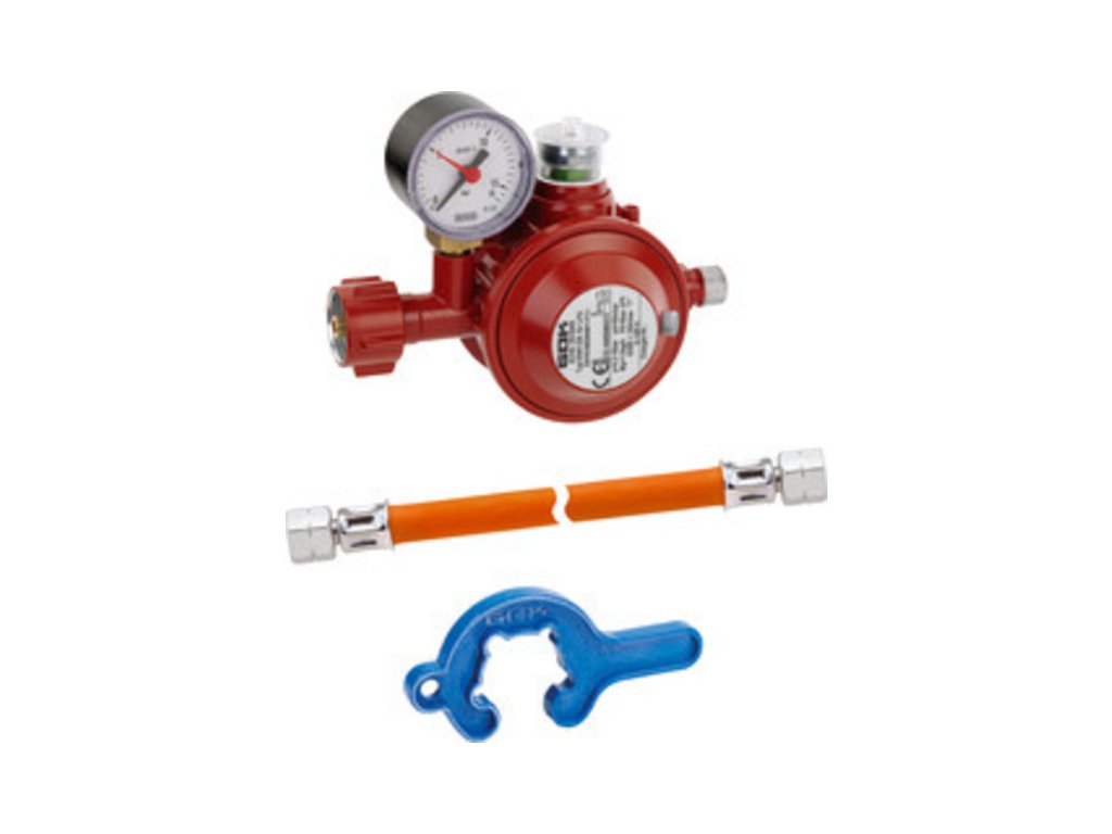 Regulátor plynového tlaku s výhledem a hadicí. Pro regulaci tlaku na jmenovitý tlak plynového zařízení. Sada pro připojení plynového zařízení, např. plynového grilu, vařiče nebo plynového topidla venku. Otestováno podle DIN-DVGW nebo EG typového schválení. Skládá se z: regulátoru nízkého tlaku typu EN61-DS s přetlakovou bezpečnostní zařízení S2SR (ÜDS), viditelným ukazatelem, tepelnou uzavírací zařízení "T" (TAE), manometru, středotlaké hadice (guma s textilní vložkou; odolná proti chladu až do -30 °C; rozměr hadice 6,3 x 3,5 mm) G 1/4 LH-ÜM x G 1/4 LH-ÜM x 400 mm a MiniTool.