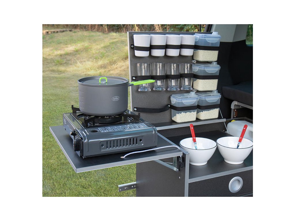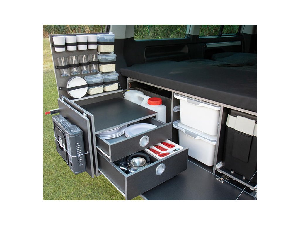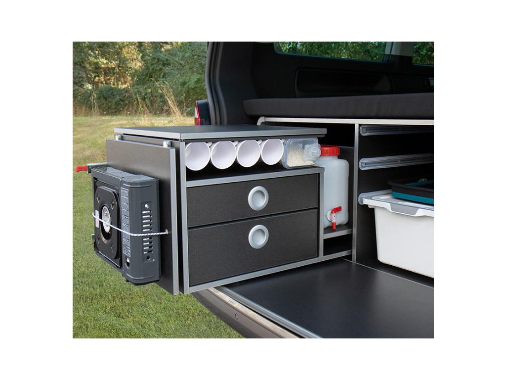 Box je dodáván s kuchyňským výsuvem na levé straně, včetně skládacího dřezu, 12l kanystru na čerstvou vodu, plynového sporáku s 1 plotýnkou na skládací desce.