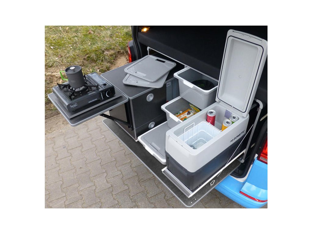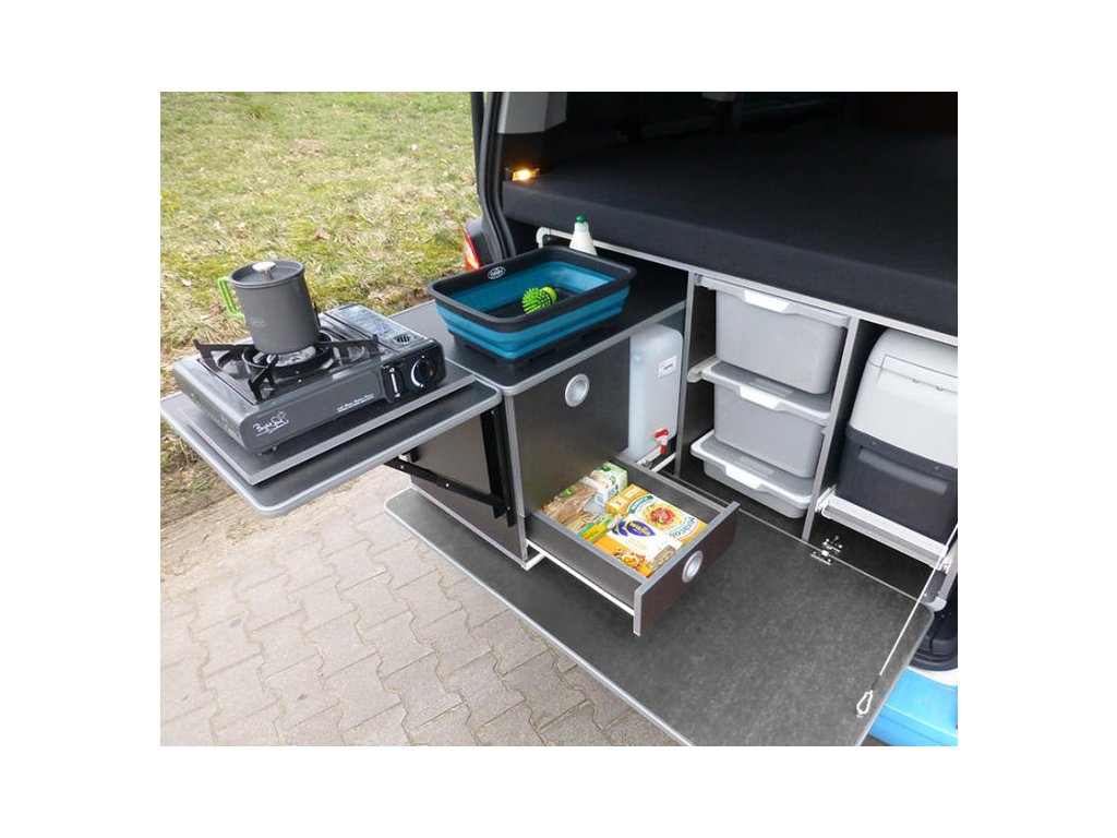 Box je vybaven skládacím dřezem, dvěma 10L kanystry na čerstvou vodu s kohoutkem,plynovým sporákem s 1 hořákem, 2 zásuvkami, přihrádkou na příbory a skládací poličkou.