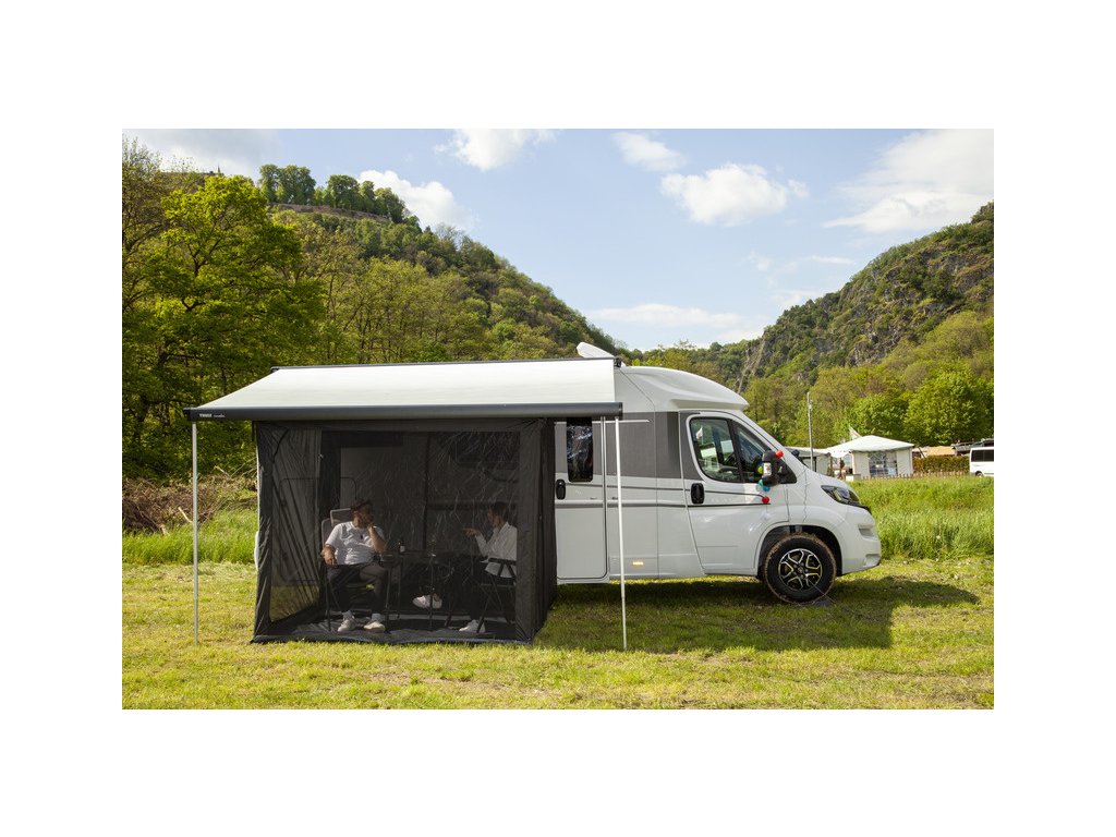 Prémiová verze je vybavena všitým dnem. Stan je vhodný pro mnoho velikostí markýz, protože háčky jsou připevněny k nastavitelným popruhům, které lze flexibilně nastavit. Upevnění k zemi se provádí pomocí kolíků. Stan s moskytiérou má 2 boční vchody a velké dveře do vozidla. (Zip)