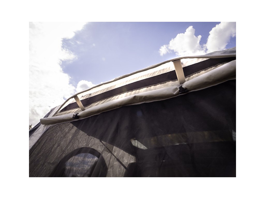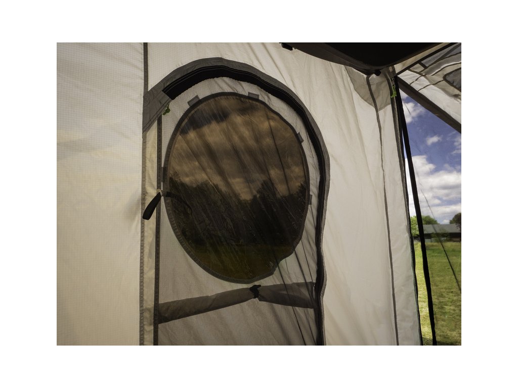 - Přední dveře mají další okno s moskytiérou a lze je také nastavit jako sluneční plachtu.