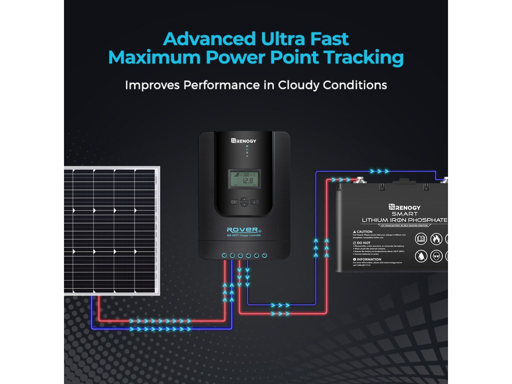 Renogy Rover Li 40A MPPT je výkonný a spolehlivý solární regulátor nabíjení navržený pro efektivní využití energie ze solárních panelů. Díky moderní MPPT technologii maximalizuje výkon solárního systému a zajišťuje rychlé, stabilní a bezpečné nabíjení baterií.