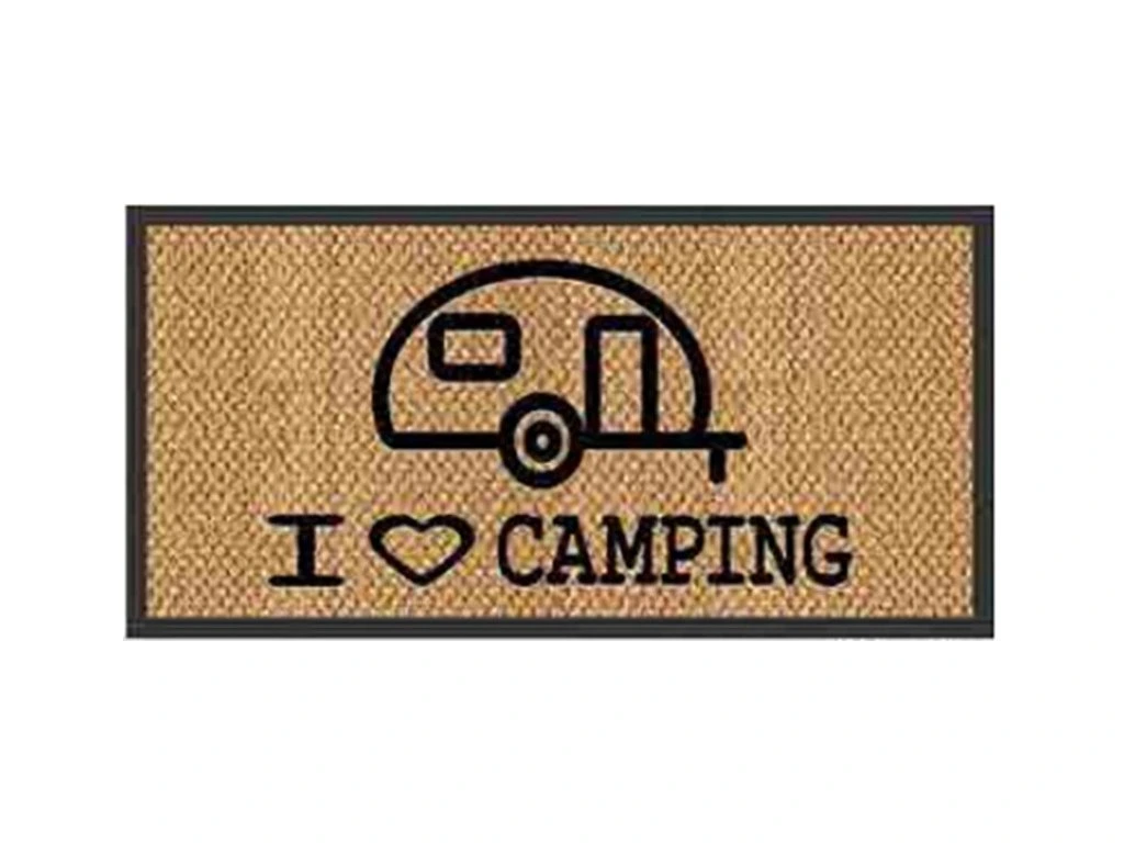Rohož je natisknutá motivem obytného vozu s nápisem „I love Camping“, což vytváří osobitý kempingový styl.
