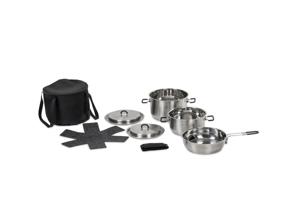 Kempovací kuchyňská souprava určená pro použití při karavaningu, obytných vozech, stanech i outdoorových výletech. Sada je navržena tak, aby byla odolná, skladná a snadno přenosná, a obvykle se prodává i s ochrannou taškou a filcovou podložkou / rohoží, která chrání povrchy a usnadňuje uložení.