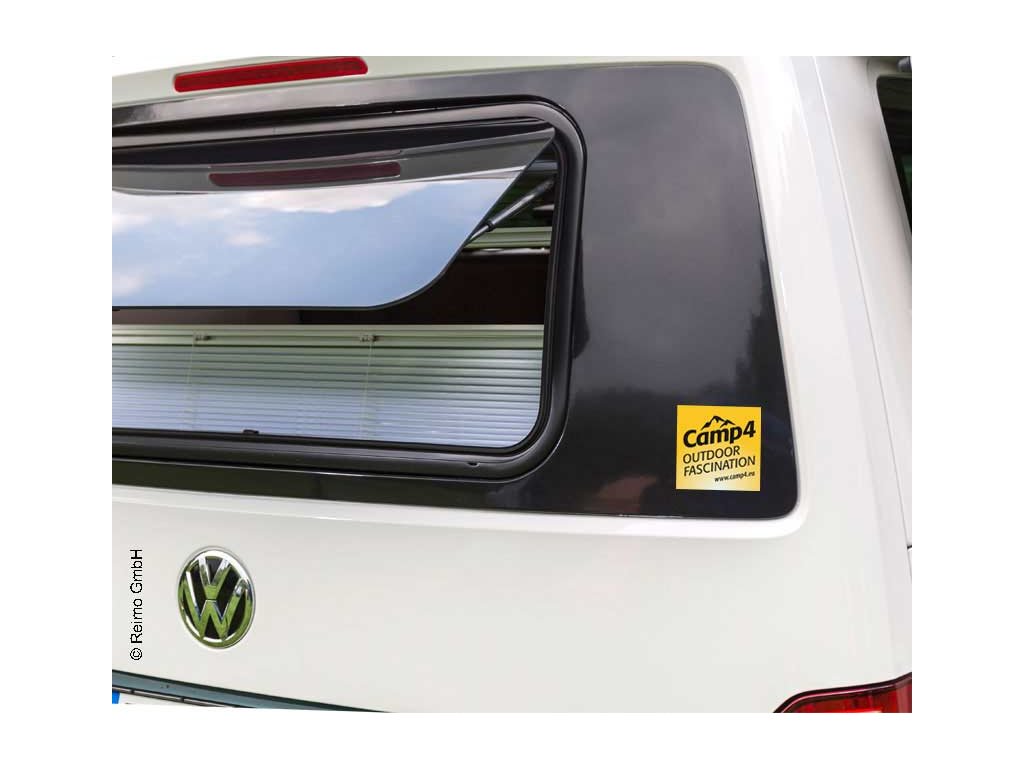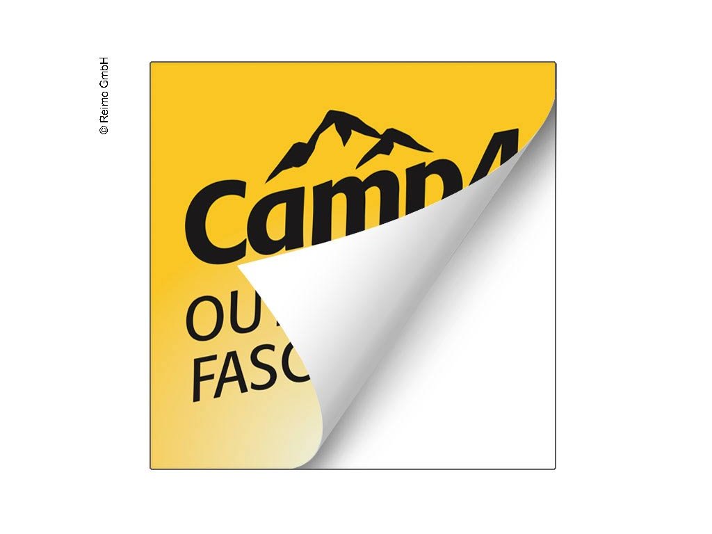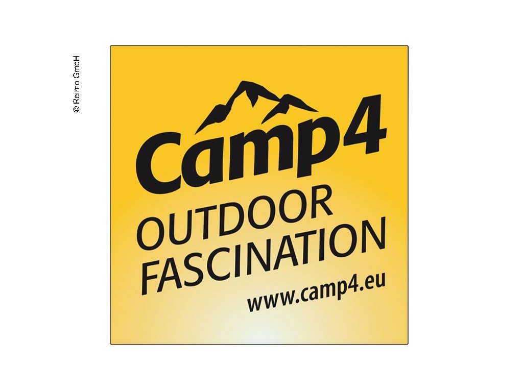 Dekorativní samolepka určená pro automobily, karavany, obytné vozy nebo jiné hladké povrchy. Nese motiv „Camp4“, který reprezentuje outdoorovou a kempingovou značku Camp4, často spojenou s vybavením pro karavany, camping a volnočasové cestování.