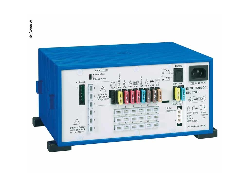Elektroblok EBL 208 obsahuje modul nabíjení akumulátoru (18 A, charakteristika nabíjení IUoU), kompletní rozvod 12 V, pojistkovou ochranu hlavního vypínače 12 V, energeticky úsporný spínací stupeň pro vodní čerpadlo, vhodný pro 6článkový olověné a olověné gelové baterie (výběr pomocí spínače), vypínač pro odpojení baterie při zimním vypnutí (bez klidové spotřeby proudu), monitor baterií pro vypnutí 12 V spotřebičů v případě podpětí v baterii obytného prostoru. Výstupy 12 V rozvodu jsou jednotlivě jištěny, některé lze spínat pomocí relé.