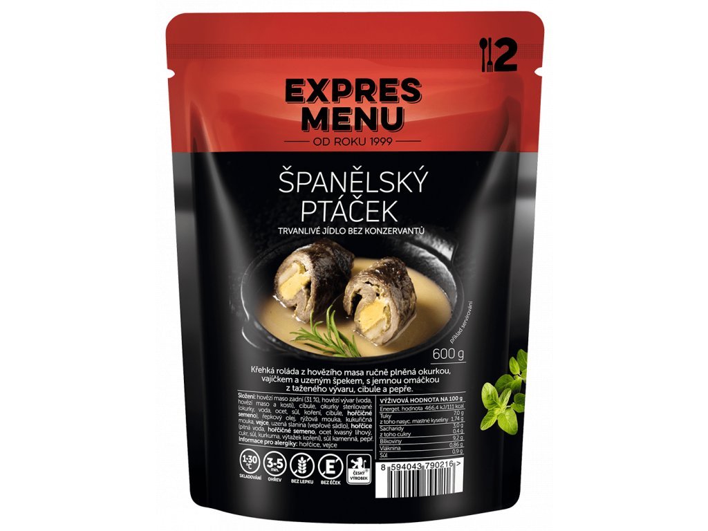 Španělský ptáček Expres Menu 600 g (dvě porce) je poctivá česká klasika z křehké hovězí rolády ručně plněné okurkou, vajíčkem a uzeným špekem. Roláda je podávána v jemné, poctivé omáčce připravené z taženého hovězího vývaru, cibule a pepře, která dodává pokrmu výraznou a tradiční chuť. Španělský ptáček je připraven bez konzervantů a díky šetrné sterilaci si uchovává plnou chuť, šťavnaté maso i dlouhou trvanlivost. Ideální jídlo na doma, do práce, na cesty, do kempu i na dovolenou – vždy připravené během pár minut.