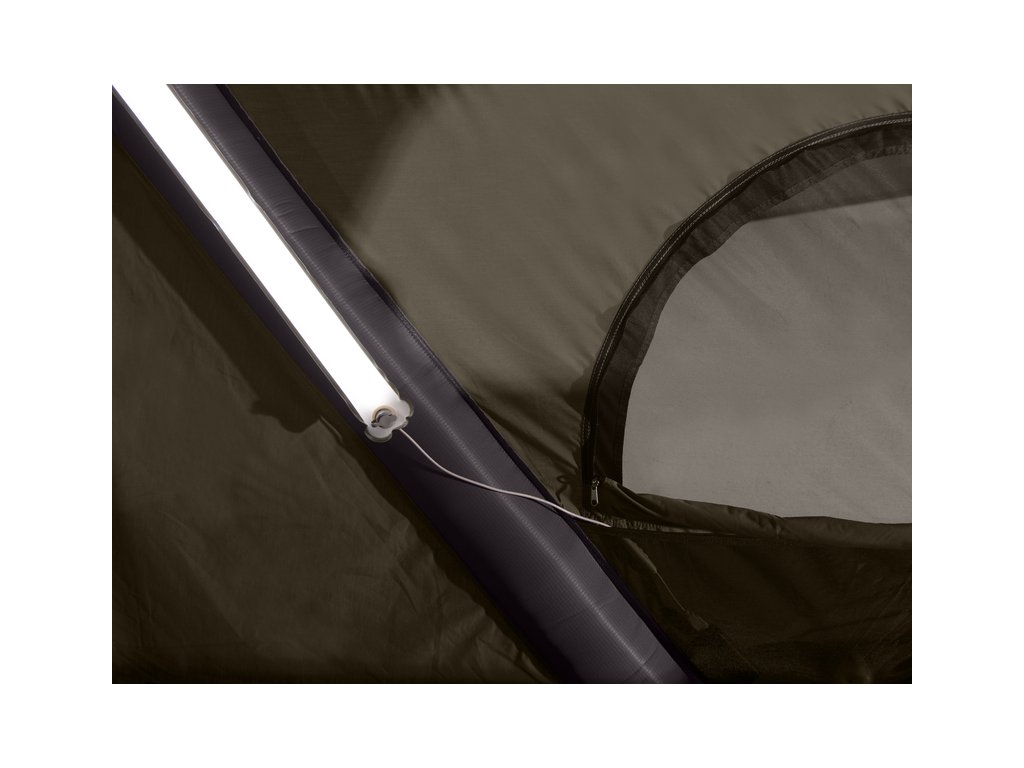 GT Roof je zcela nafukovací – místo konstrukčních tyčí se používají nafukovací komory, které stan zpevní a drží tvar. Při použití elektrické pumpy 12 V je stan připraven během cca 8 minut.