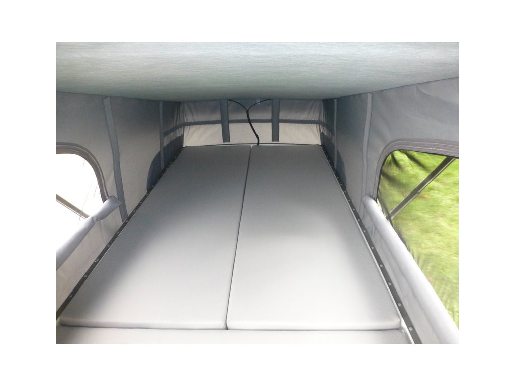 Celá montáž probíhá nad střešním plechem, pro výřez střechy stačí např. otvor pro okno Heki. Zajištění střechy pomocí popruhů. Matrace leží podvětrně přímo na střešním plechu.
