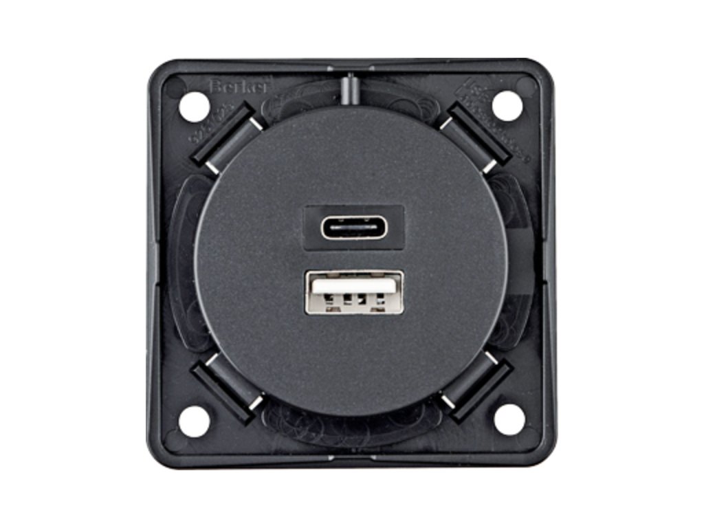 Berker 12 V USB nabíjecí zásuvka s dvojitou USB zásuvkou: 1 USB zásuvka typu A a 1 USB zásuvka typu C.