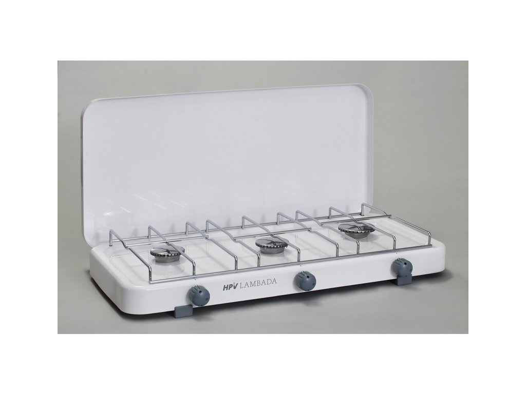 HPV Lambada 3-flammig Gaskocher s Zündsicherung (50 mbar) je tříhořákový plynový vařič s pojistkou plamene, vhodný pro venkovní vaření i použití v karavanu či stanové kuchyni. Nabízí dobrý výkon, stabilní konstrukci a bezpečnější ovládání díky integrované pojistce.