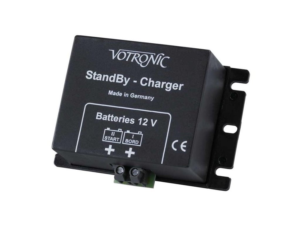 VOTRONIC StandBy-Charger se používá k automatickému dobíjení a udržování nabití startovací baterie nebo přídavné baterie, pokud má síťová nabíječka, solární regulátor nabíjení nebo generátor pouze jeden nabíjecí výstup. Zařízení lze snadno dovybavit jednoduchým přepínáním mezi palubními a startovacími bateriemi nebo palubními a přídavnými bateriemi, aniž byste museli měnit stávající kabeláž.