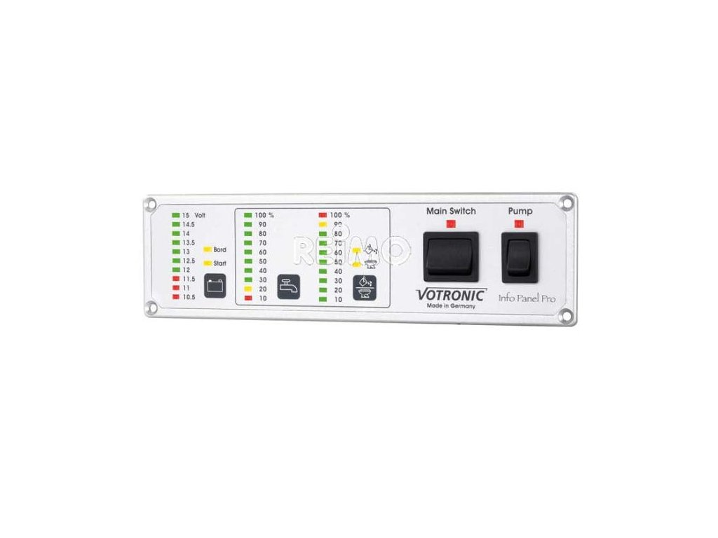 Kompaktní a robustní panel přináší volbu sledování stavu napětí palubní a startovací baterie, stavu naplnění nádrží na pitnou i odpadní vodu na jediném kontrolním panelu.