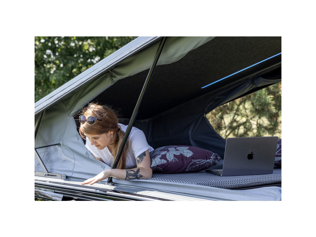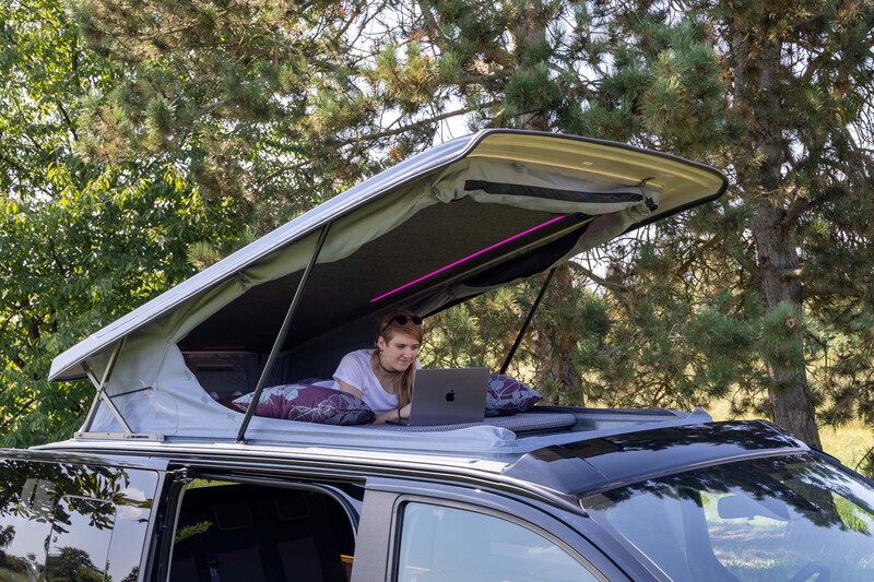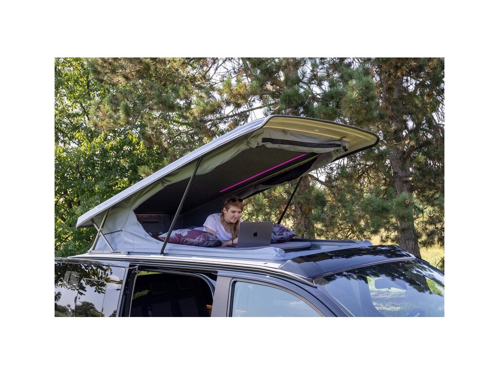 Díky prostorné nůžkové (skládané) konstrukci poskytuje spací střecha dostatek prostoru a volnosti pohybu. Otevírání je snadné a pohodlné – manuálně nebo volitelně elektricky. Výsledkem je vzdušný a světlý interiér, který výrazně zvyšuje komfort při spaní i pobytu ve voze.